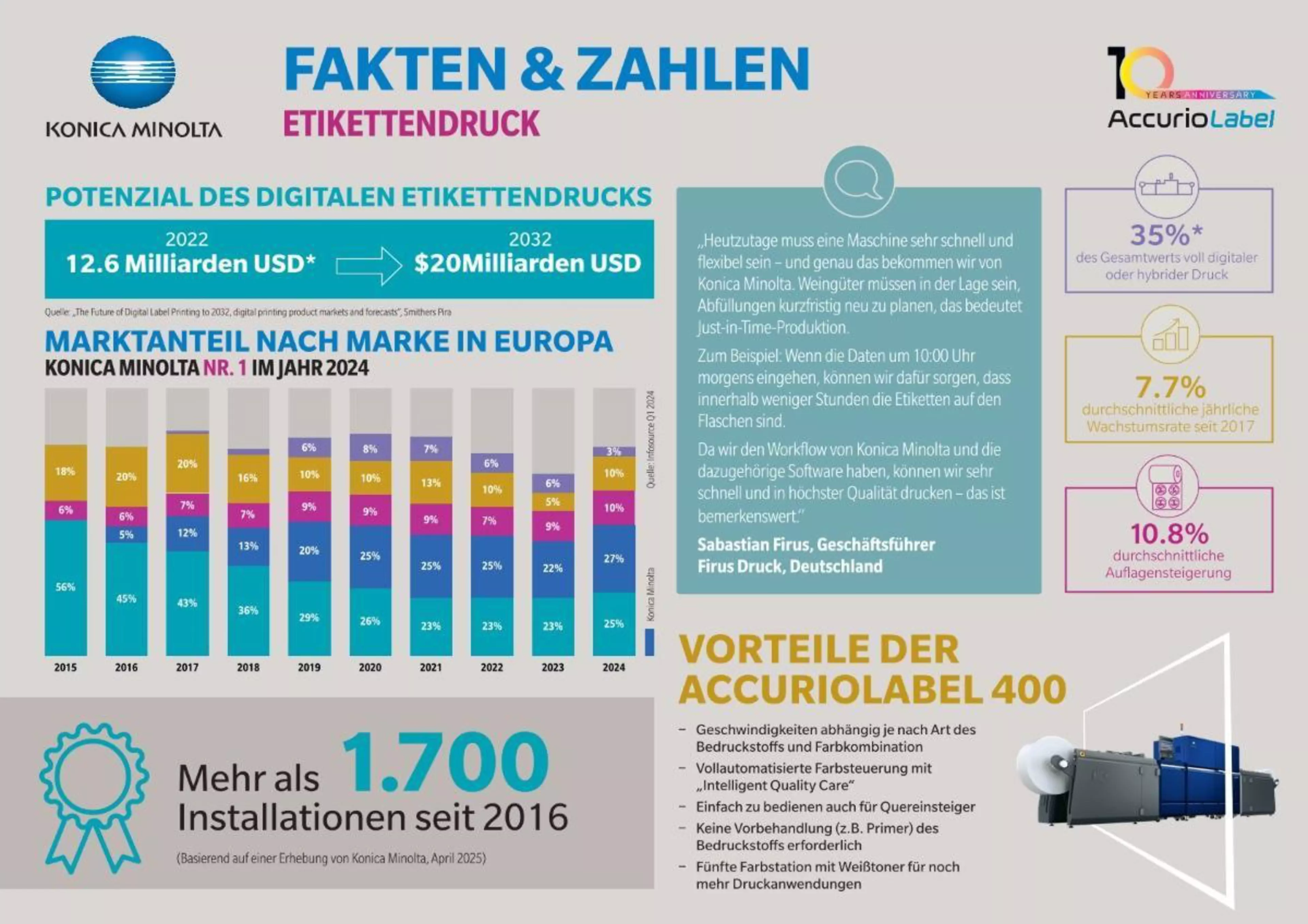 Die Stimmung auf der Labelexpo Europe 2025 war gut, denn die Etikettenproduktion hat in den vergangenen Jahren stark an Bedeutung gewonnen und in dieser Tonart dürfte es auch weitergehen. Sie ist ein wachsender und profitabler, gleichwohl umkämpfter Bereich. Besonders positiv sieht es für den digitalen Etikettendruck aus. Der weltweite Markt soll laut den Analysten von Smithers Pira von 2022 bis 2032 um fast 60 Prozent auf 17 Milliarden Euro wachsen. Denn mit Digitaldruck können auch kleine Auflagen wirtschaftlich produziert werden, da keine Druckplatten hergestellt und die Maschinen nicht aufwendig eingerichtet werden müssen. Dieser Vorteil wird angesichts des Trends zur Flexibilisierung und Individualisierung – also zu immer kleineren Auflagen – noch wichtiger. Zugleich werden schrittweise auch bei größeren Auflagen digitale Technologien immer wirtschaftlicher im Vergleich zu analogen.